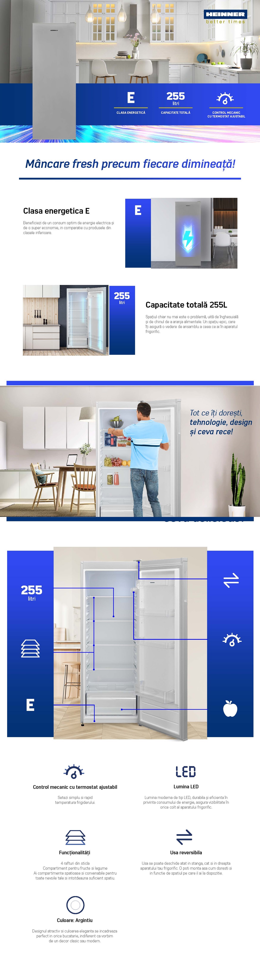 Frigider Heinner HF-V255SE++, clasa energetica E, capacitate totala: 255L, capacitate frigider: 255L, control mecanic cu termostat ajustabil, dotari frigider: 4 rafturi din sticla, compartiment pentru fructe si legume, lumina LED, usa reversibila, dimensiuni (LxAxI): 54 x 59.5 x 145.5 cm, culoare: Argintiu