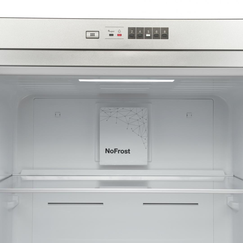 Frigider cu o usa Heinner HF-V401NFXF+, Full No frost, clasa energetica: F, capacitate totala: 389L, control electronic, lumina LED, functie Super racire, 4 rafturi sticla, 1 compartiment pentru fructe si legume cu control nivel umiditate, 1 compartiment Chiller, suport oua, dimensiuni (WxDxH): 59.5 x 65 x 186 cm, culoare: Aspect inox