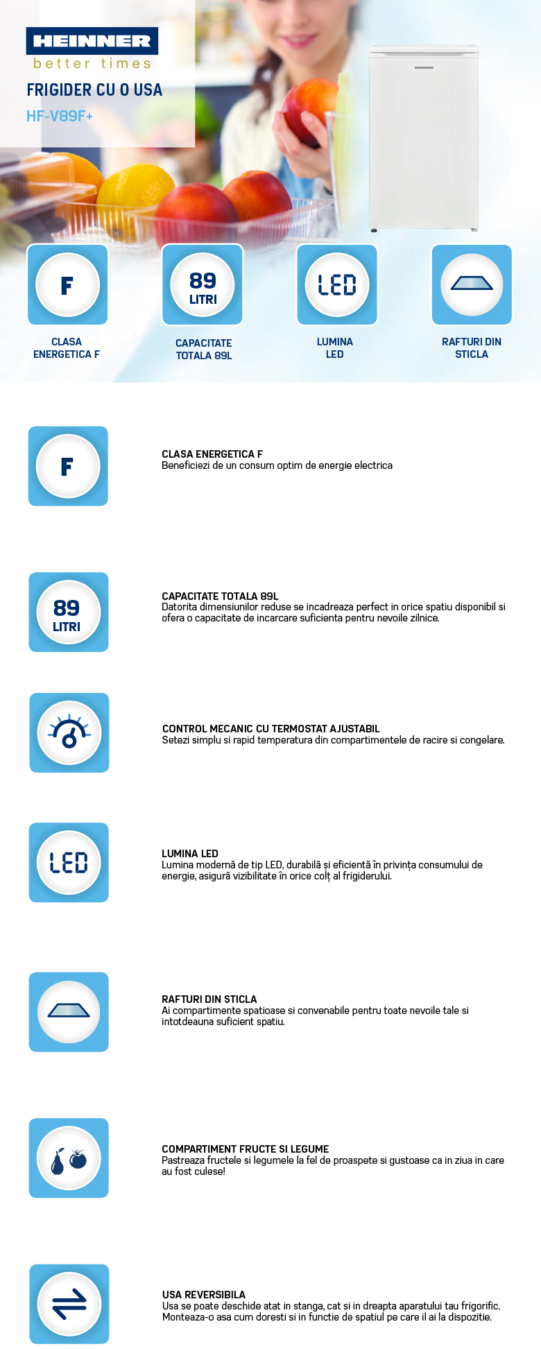 Frigider Heinner HF-V89F+, clasa energetica: F, Capacitate totala: 89L, Control mecanic cu termostat ajustabil, Lumina LED, raft din sticla, compartiment fructe si legume, usa reversibila, dimensiuni produs (WxDxH): 48 x 50 x 82.1 cm, culoare: alb