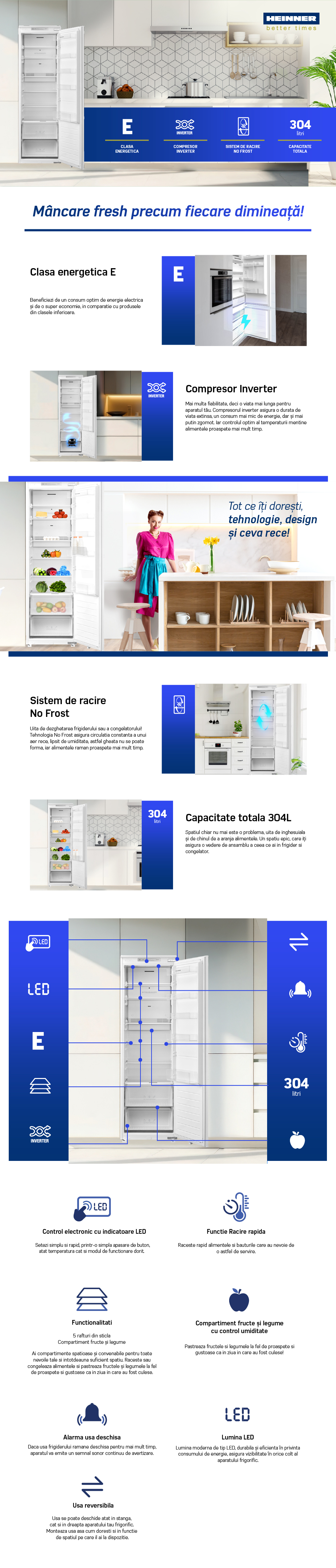 Frigider incorporabil Heinner HF-BIM304NFINVE++, No Frost, clasa energetica: E, compresor Inverter, capacitate totala: 304L, panou de control cu leduri, control electronic, functie Super racire, compartiment pentru fructe si legume cu control nivel umiditate, compartiment fructe si legume, 5 rafturi din sticla, lumina LED, alarma usa deschisa, usa reversibila, dimensiuni (LxAxI): 54 x 55 x 178.5 cm