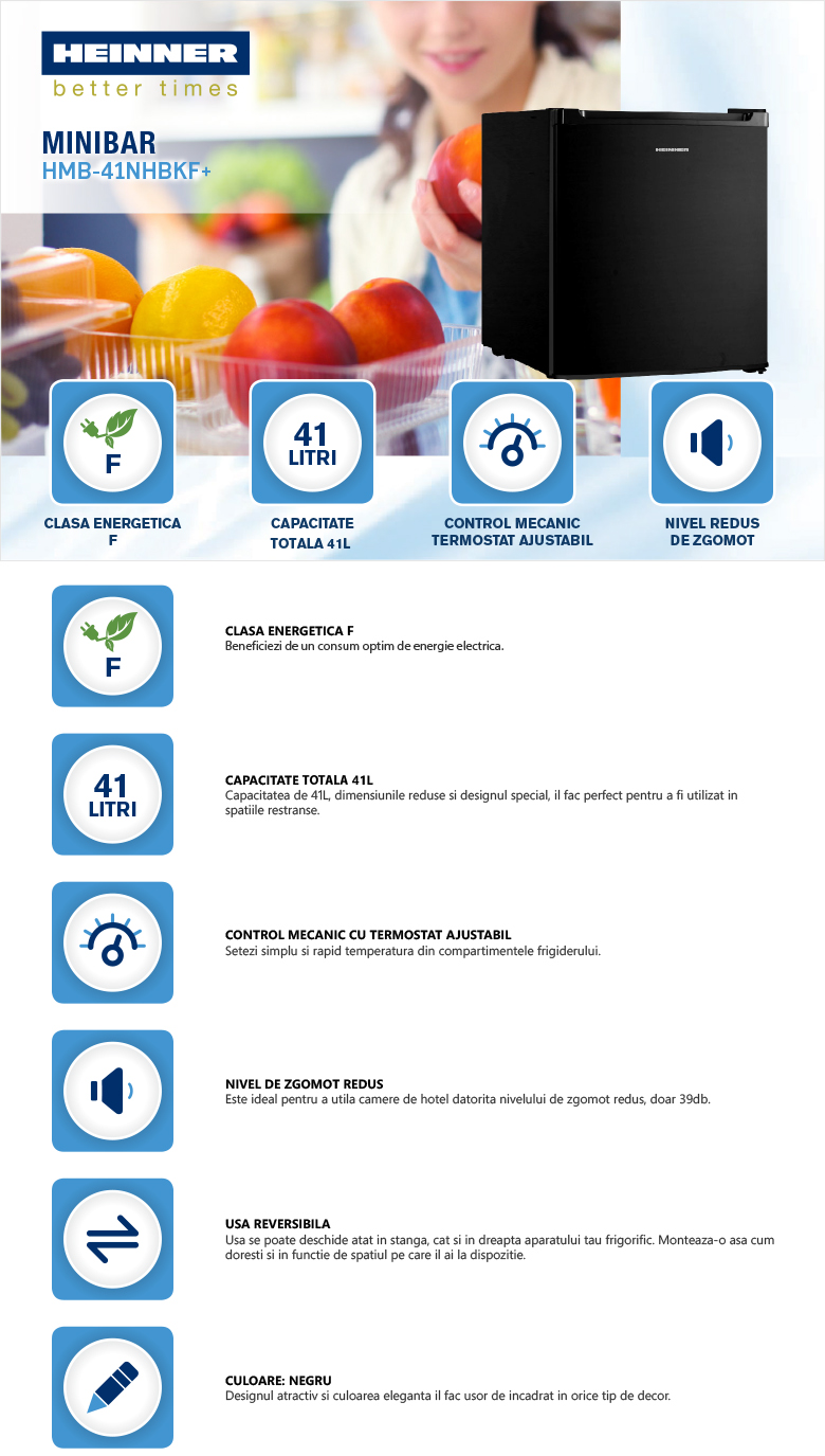Frigider mini-bar Heinner HMB-41NHBKF+, clasa energetica: F, capacitate totala: 41L, control mecanic cu termostat ajustabil, 1 raft sarma, usa reversibila, dimensiuni (WxDxH): 44 x 47 x 51 cm, culoare: negru