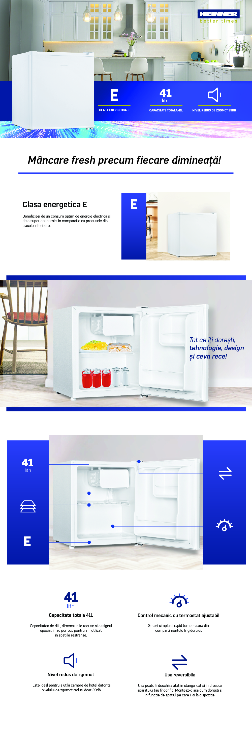 Frigider Mini-Bar Heinner HMB-HM41E++, clasa energetica: E, capacitate totala: 41L, control mecanic cu termostat ajustabil, 1 raft sarma, usa reversibila, dimensiuni (WxDxH): 44 x 47 x 51 cm, culoare: Alb