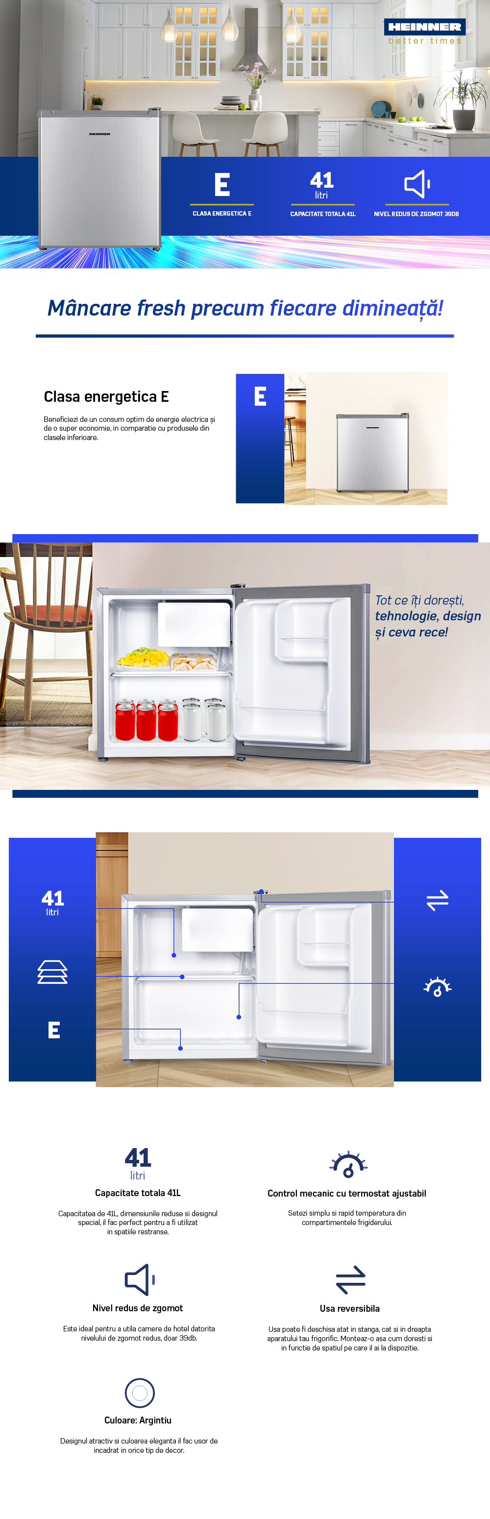 Mini-bar Heinner HMB-HM41SE++, clasa energetica: E, capacitate totala: 41L, control mecanic cu termostat ajustabil, 1 raft sarma, usa reversibila, dimensiuni (WxDxH): 44 x 47 x 51 cm, culoare: Argintiu