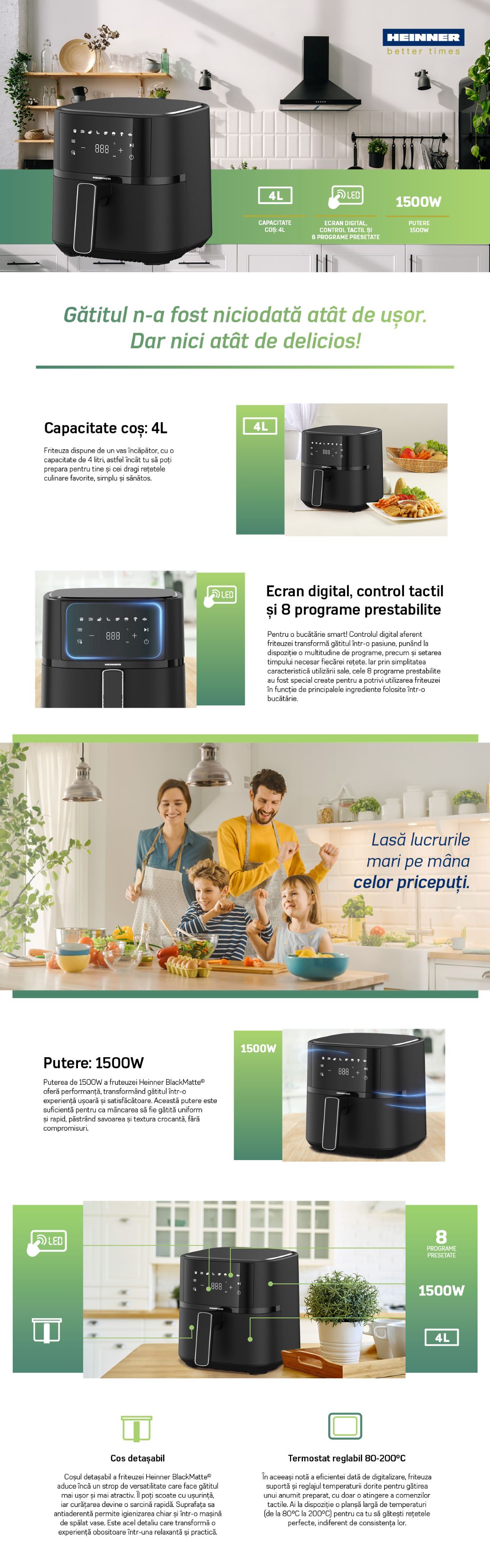 FRITEUZA CU AER CALD HEINNER HAF-B4BK1500, 1500W, CAPACITATE COS: 4L, DISPLAY DIGITAL, CAVITATE METAL, TEMPERATURA: 80-200°C, TIMER: 60 MIN, 8 PROGRAME PRESETATE, COS DETASABIL, AUTO-OPRIRE, CARCASA FINISAJ MAT, NEGRU