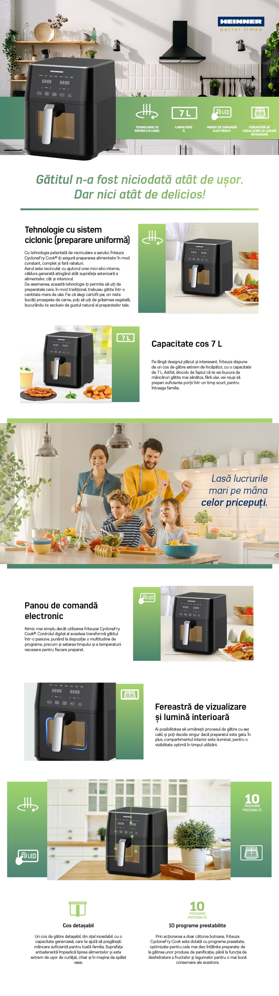 FRITEUZA CU AER CALD HEINNER CYCLONEFRY COOK HAF-M7BK1800, 1500-1800W, CAPACITATE: 7L, TEHNOLOGIE CIRCULARE AER (GATIRE UNIFORMA), DISPLAY DIGITAL CU CONTROL TOUCH, TIMER 60 MIN, TEMPERATURA 40-200 GRADE, 10 PROGRAME PRESETATE (MENTINERE CALD INCLUSA), COS DETASABIL ANTIADERENT, FEREASTRA SUPRAVEGHERE, LUMINA INTERNA, CAVITATE METAL, FUNCTIE MEMORARE, AUTO-OPRIRE, NEGRU