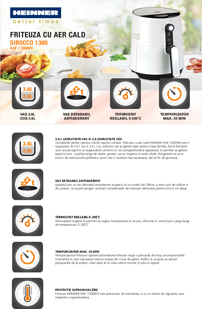 Friteuza cu aer cald Heinner HAF-1300WH, capacitate totala vas: 3.6L, vas antiaderent, caapcitate cos: 2.6L, termostat reglabil: 0-200 grade C, timer max: 30 min, maner rece, protectie supraincalzire, putere: 1300W