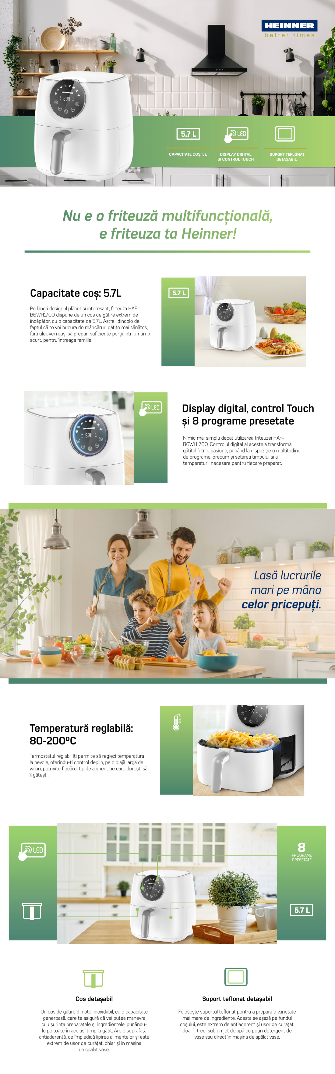Friteuza cu aer cald Heinner SmartFry HAF-B6WH1700, putere: 1700W, capacitate: 5.7L, display digital cu control tactil, timer 60 min, temperatura 80- 200°C, 8 programe presetate, cos detasabil, oprire automata, picioruse anti-alunecare, alb
