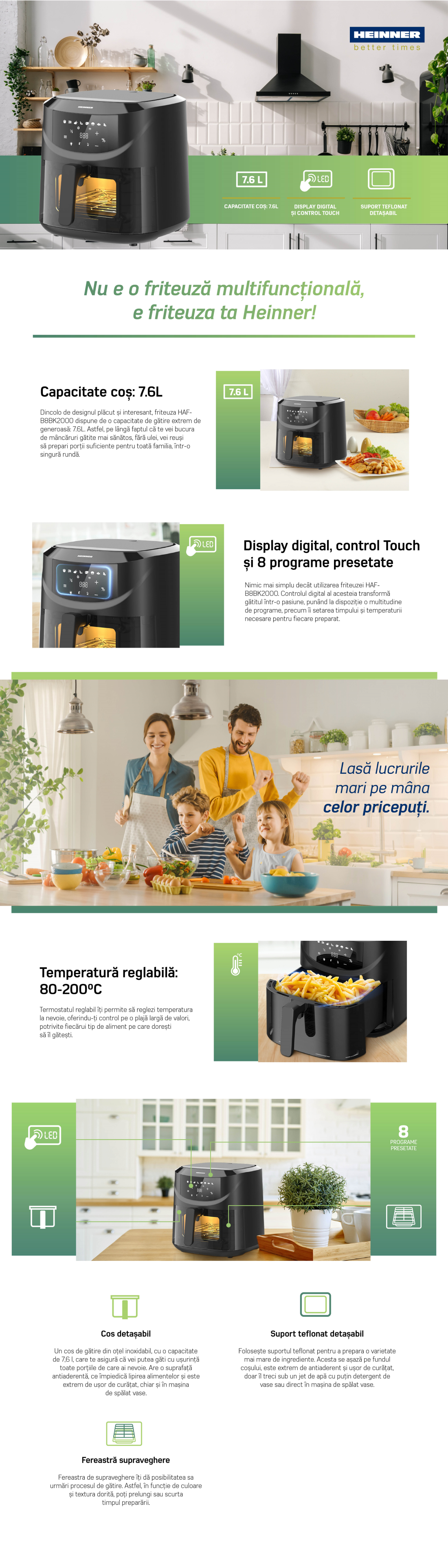 FRITEUZA CU AER CALD HEINNER SPACEFRY HAF-B8BK2000, 2000W, CAPACITATE: 7.6L, DISPLAY DIGITAL CU CONTROL TOUCH, TIMER 60 MIN, TEMPERATURA 80-200 GRADE, FEREASTRA SUPRAVEGHERE, SUPORT TEFLONAT DETASABIL, OPRIRE AUTOMATA, NEGRU
