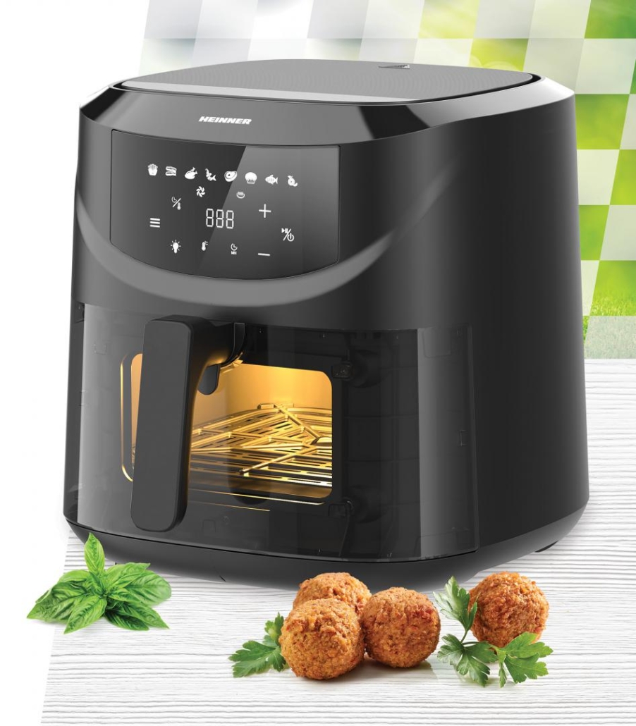 FRITEUZA CU AER CALD HEINNER SPACEFRY HAF-B8BK2000, 2000W, CAPACITATE: 7.6L, DISPLAY DIGITAL CU CONTROL TOUCH, TIMER 60 MIN, TEMPERATURA 80-200 GRADE, FEREASTRA SUPRAVEGHERE, SUPORT TEFLONAT DETASABIL, OPRIRE AUTOMATA, NEGRU
