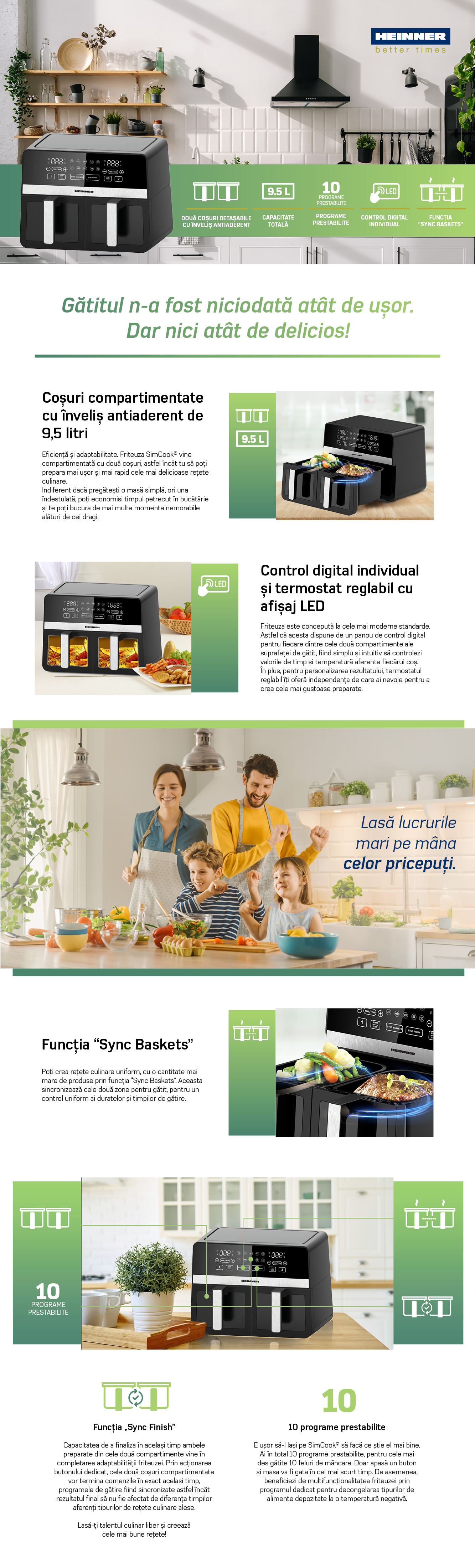 FRITEUZA DUBLA CU AER CALD HEINNER SIMCOOK HAF-K10DB24BK, 2400W, CAPACITATE TOTALA: 9.5L, TERMOSTAT AJUSTABIL CU DISPLAY LED, CONTROL DIGITAL INDIVIDUAL, 10 PROGRAME PRESETATE, FUNCTIE DECONGELARE, TIMER 60 MIN, CUVA CU INVELIS ANTIADERENT, NEGRU