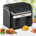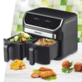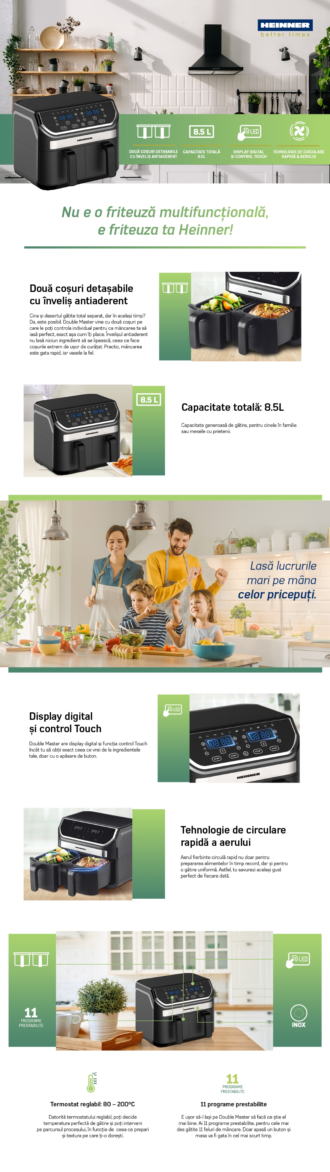 Friteuza dubla cu aer cald Heinner Double Master HAF-KDB1700BK, capacitate totala: 8.5L, putere: 1700W, doua cosuri detasabile antiaderente, tehnologie de circulare rapida a aerului, display digital cu control Touch, 11 programe presetate, temperatura 80-200 grade, timer 60 min, negru