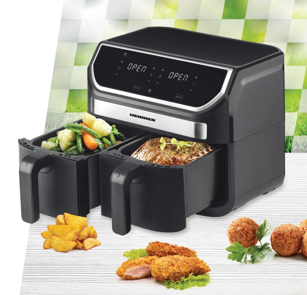 Friteuza dubla cu aer cald Heinner Double Master HAF-KDB1700BK, capacitate totala: 8.5L, putere: 1700W, doua cosuri detasabile antiaderente, tehnologie de circulare rapida a aerului, display digital cu control Touch, 11 programe presetate, temperatura 80-200 grade, timer 60 min, negru