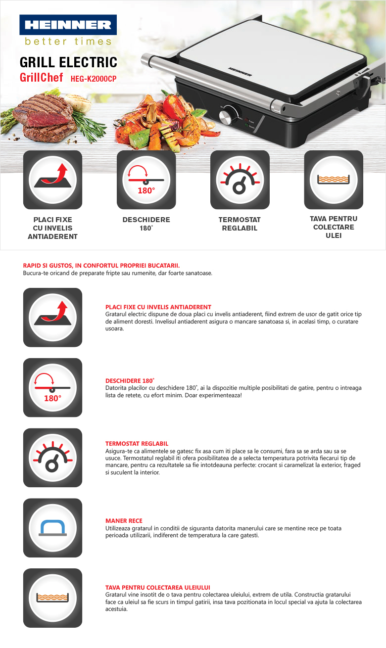 Placi fixe cu invelis antiaderent, dimensiuni placi: 30 x 24.9 cm, temperatura reglabila, maner rece, deschidere 180˚, indicator luminos “ON” si “Gata de folosire”, tava pentru colectarea uleiului, putere: 2000W
