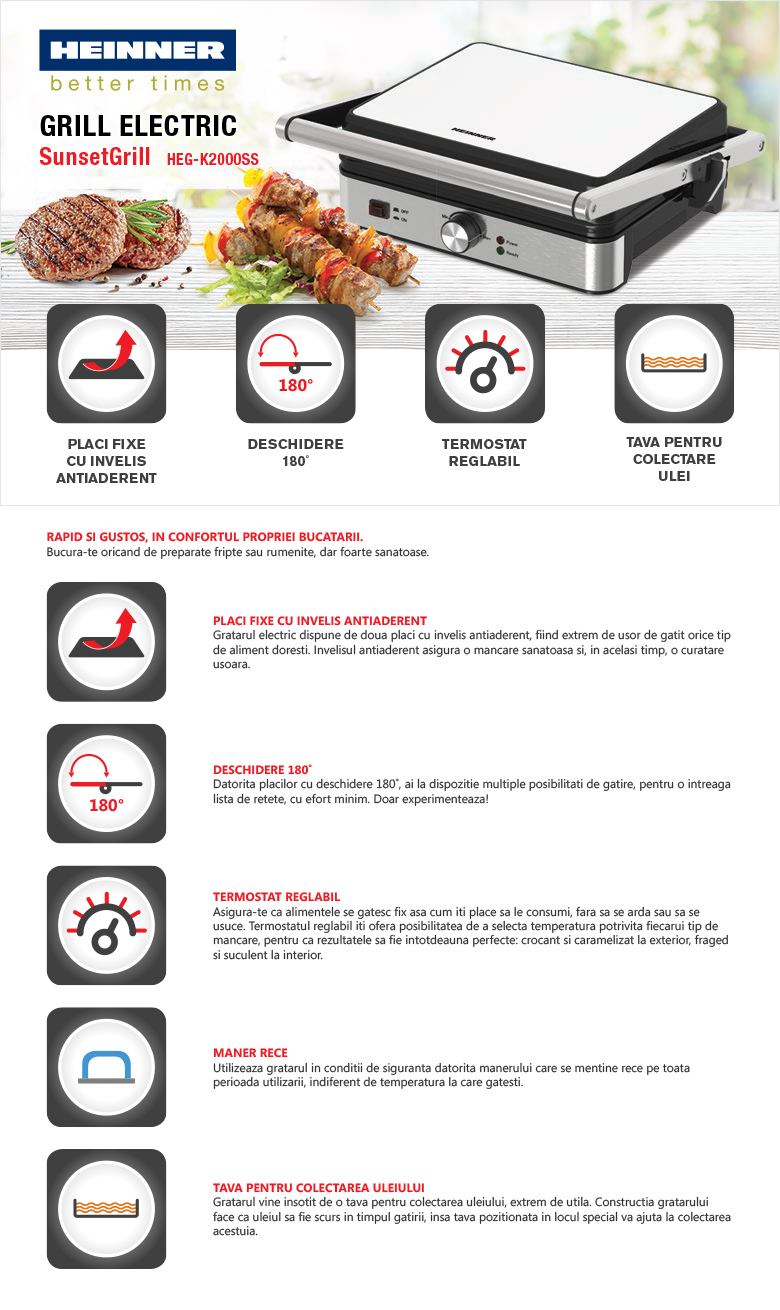 Placi fixe cu invelis antiaderent, dimensiuni placi: 30 x 24.9 cm, temperatura reglabila, maner rece, deschidere 180˚, indicator luminos “ON” si “Gata de folosire”, tava pentru colectarea uleiului, putere: 2000W