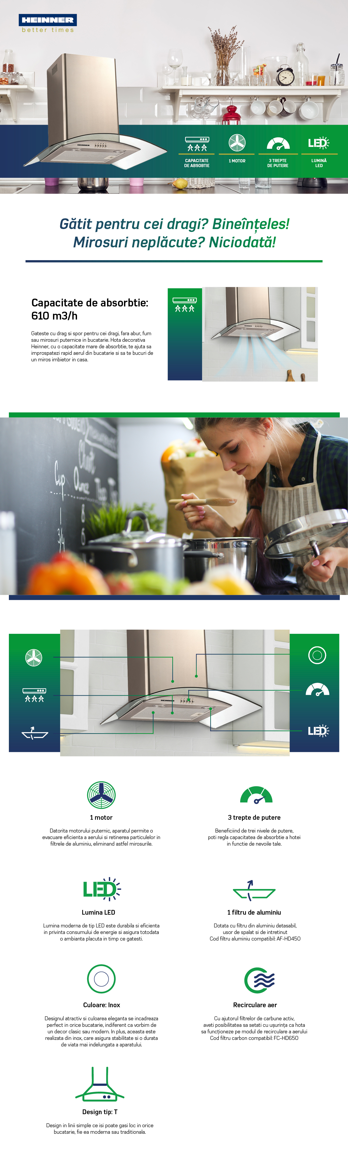 Hota decorativa Heinner DCH-650GX, 60cm, Design "T-Shape", Putere maxima de absorbtie: 610 m3/h, 3 trepte de viteza, Motor: 1 x 190W, Lumina LED: 2 x 2W, 1 filtru aluminiu, Butoane tip “push”, Diametru tub de evacuare: 150 mm, Dimensiuni (LxAxI): 60x50x(55-103) cm, Culoare: Inox+Sticla