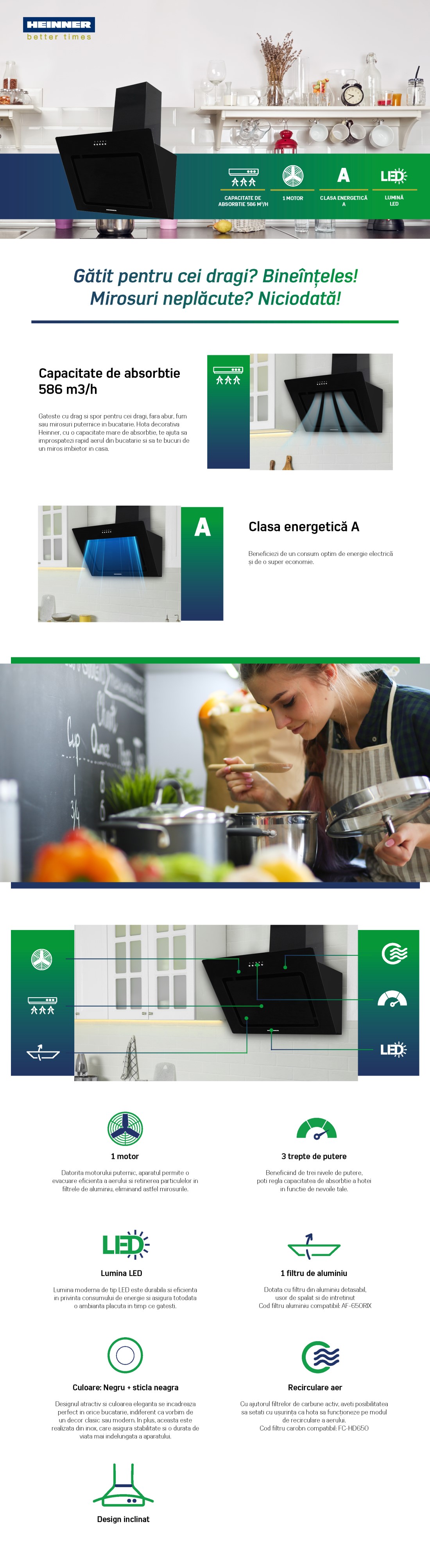 Hota decorativa Heinner DCH-650RGBK, 60cm, Design "Inclinata", Putere maxima de absorbtie: 586 m³/h, 3 trepte de viteza, Motor: 1 x 190W, Lumina LED: 2 x 2W, 1 filtru de aluminiu, Butoane tip “push”, Diametru tub evacuare: 150mm, Dimensiuni (LxAxI): 60x43x(76-114) cm, Culoare: Sticla neagra