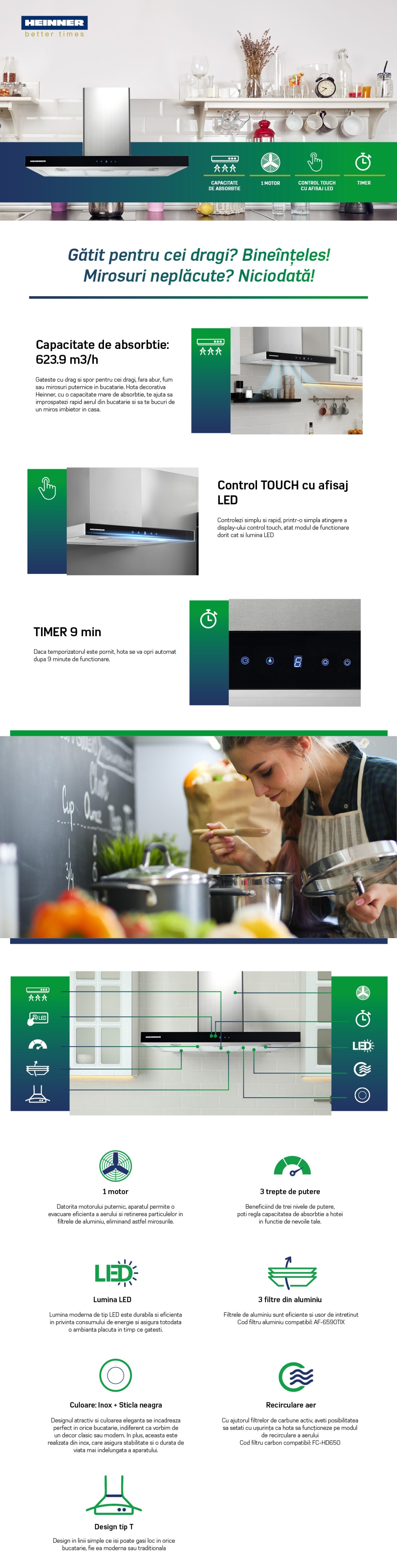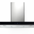 Hota decorativa Heinner DCH-6590TIX, 90cm, Design "T-Shape", Putere maxima de absorbtie: 623.9 m³/h, 3 trepte de viteza, Motor: 1 x 190W, Lumina LED: 2 x 1.5W, 3 filtre aluminiu, Control touch, Diametru tub evacuare: 150mm, Dimensiuni (LxAxI): 90x50.5x(45-83) cm, Culoare: Inox+Sticla neagra