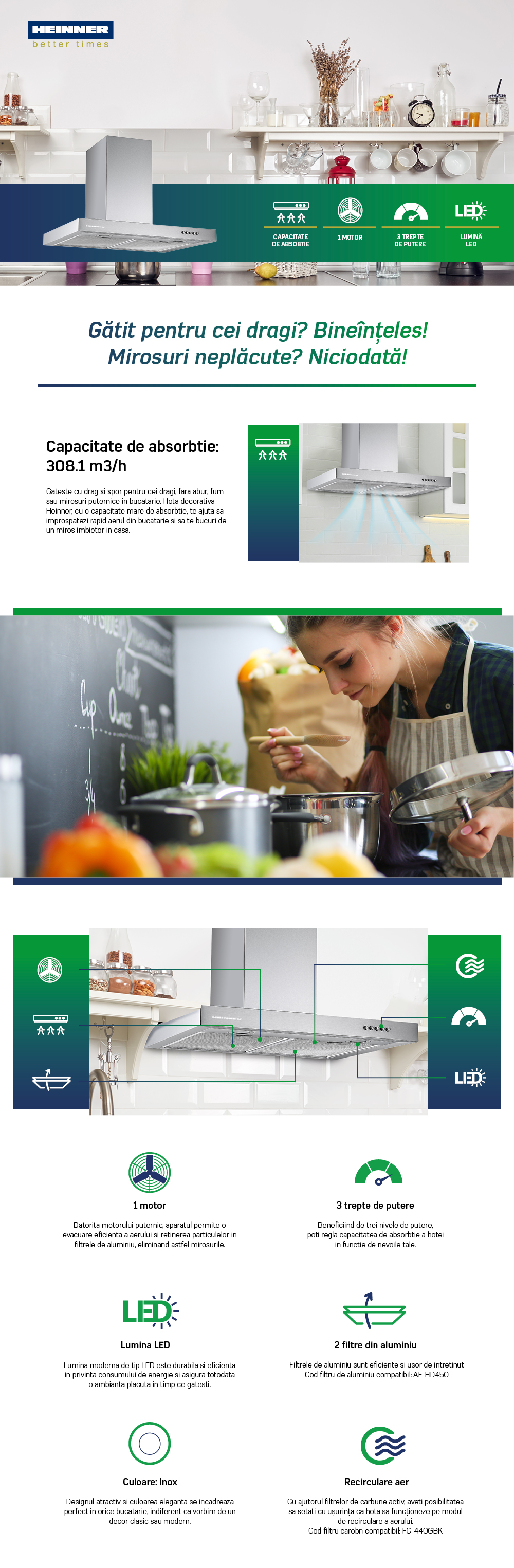 Hota decorativa Heinner HDCH-360TSS, 60cm, Design "T-Shape", Putere maxima de absorbtie: 276.4 m³/h, 3 trepte de viteza, Motor: 1 x 65W, Lumina LED: 2 x 1.5W, 2 filtre aluminiu, Butoane tip “push”, Diametru tub evacuare: 150mm, Dimensiuni (LxAxI): 60x45x(45-83) cm, Culoare: Inox