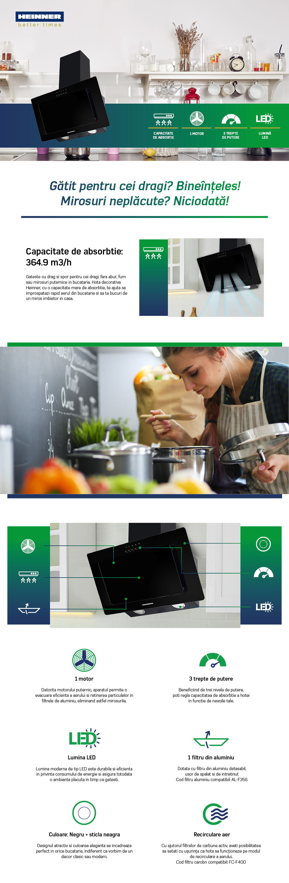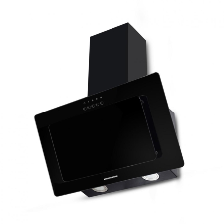 Hota decorativa Heinner HDCH-F3560RGBK, 60cm, Design "Inclinata", Putere maxima de absorbtie: 364.9 m³/h, 3 trepte de viteza, Motor: 1 x 65W, Lumina LED: 2 x 1.5W, 1 filtru de aluminiu, Butoane tip “push”, Diametru tub evacuare: 150mm, Dimensiuni (LxAxI): 59.5x28.5x(68.1-103.1) cm, Culoare: Sticla neagra