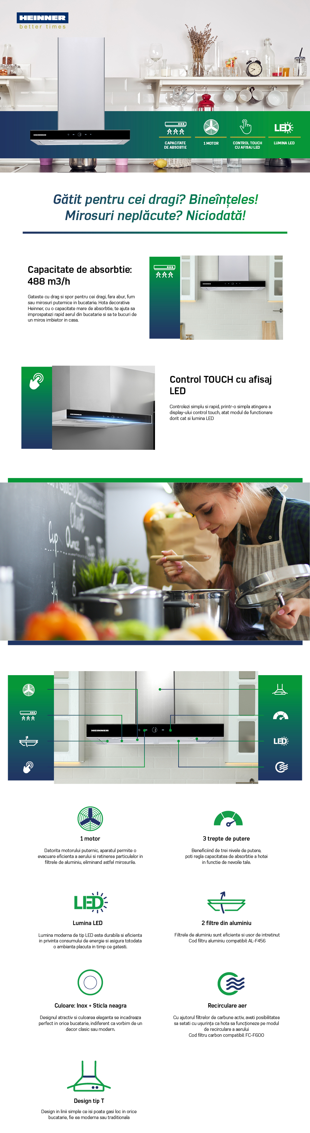 Hota decorativa Heinner HDCH-F4560TIX, 60cm, Design "T-Shape", Putere maxima de absorbtie: 488.04 m³/h, 3 trepte de viteza, Motor: 1 x 120W, Lumina LED: 2 x 1.5W, 2 filtre aluminiu, Control touch, Diametru tub evacuare: 150mm, Dimensiuni (LxAxI): 59.5x50x(54.8-99.8) cm, Culoare: Inox+Sticla neagra