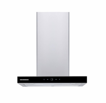Hota decorativa Heinner HDCH-F4560TIX, 60cm, Design "T-Shape", Putere maxima de absorbtie: 488.04 m³/h, 3 trepte de viteza, Motor: 1 x 120W, Lumina LED: 2 x 1.5W, 2 filtre aluminiu, Control touch, Diametru tub evacuare: 150mm, Dimensiuni (LxAxI): 59.5x50x(54.8-99.8) cm, Culoare: Inox+Sticla neagra