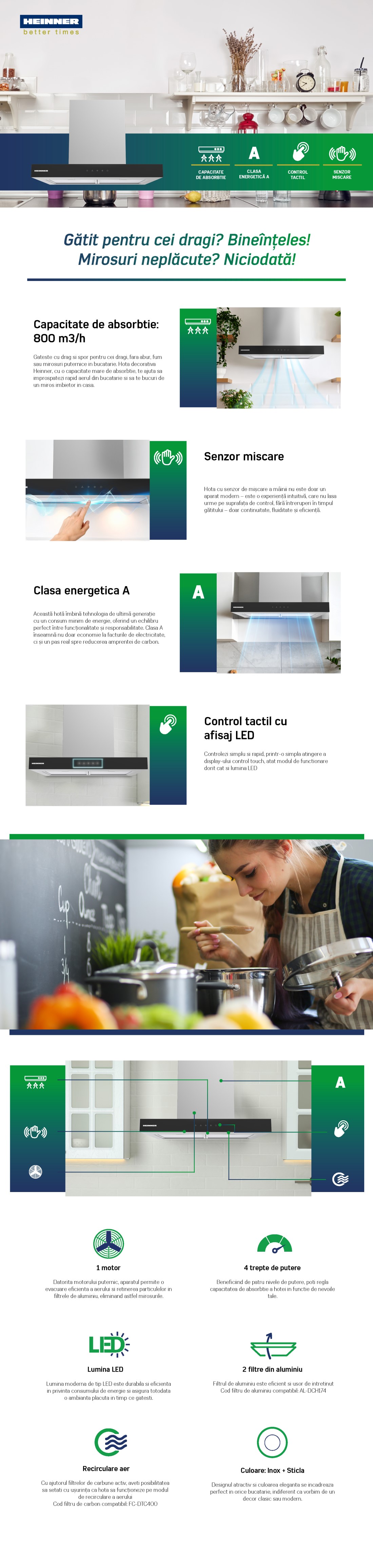 HOTA DECORATIVA HEINNER HDCH-MD60TIX, 60CM, DESIGN "T-SHAPE", PUTERE MAXIMA DE ABSORBTIE: 800 M³/H, 4 TREPTE DE VITEZA, MOTOR: 1 X 250W, LUMINA LED: 2 X 1.5W, 2 FILTRE ALUMINIU, CONTROL TOUCH, SENZOR MISCARE, DIAMETRU TUB EVACUARE: 150MM, DIMENSIUNI (LXAXI): 60X50X45 CM, CULOARE: INOX+STICLA NEAGRA