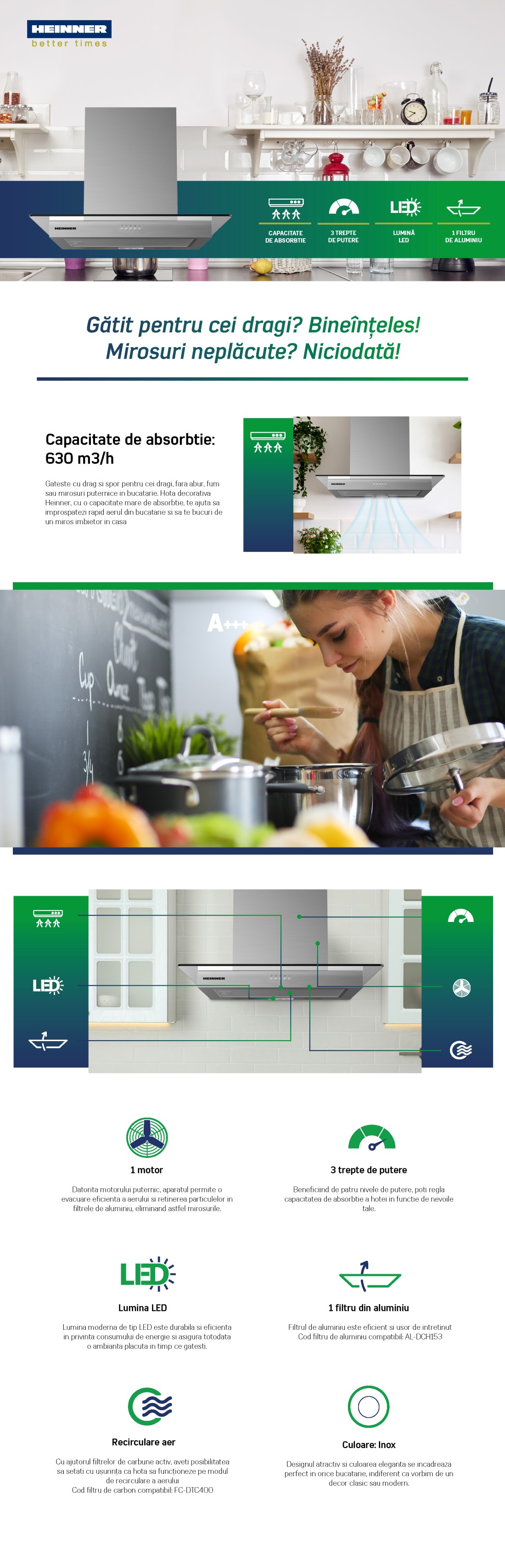 HOTA DECORATIVA HEINNER HDCH-MD630GIX, 60CM, DESIGN "T-SHAPE", PUTERE MAXIMA DE ABSORBTIE: 630 M3/H, 3 TREPTE DE VITEZA, MOTOR: 1 X 215W, LUMINA LED: 2 X 1.5W, 1 FILTRU ALUMINIU, BUTOANE TIP “PUSH”, DIAMETRU TUB DE EVACUARE: 150 MM, DIMENSIUNI (LXAXI): 60X50X44 CM, CULOARE: INOX+STICLA