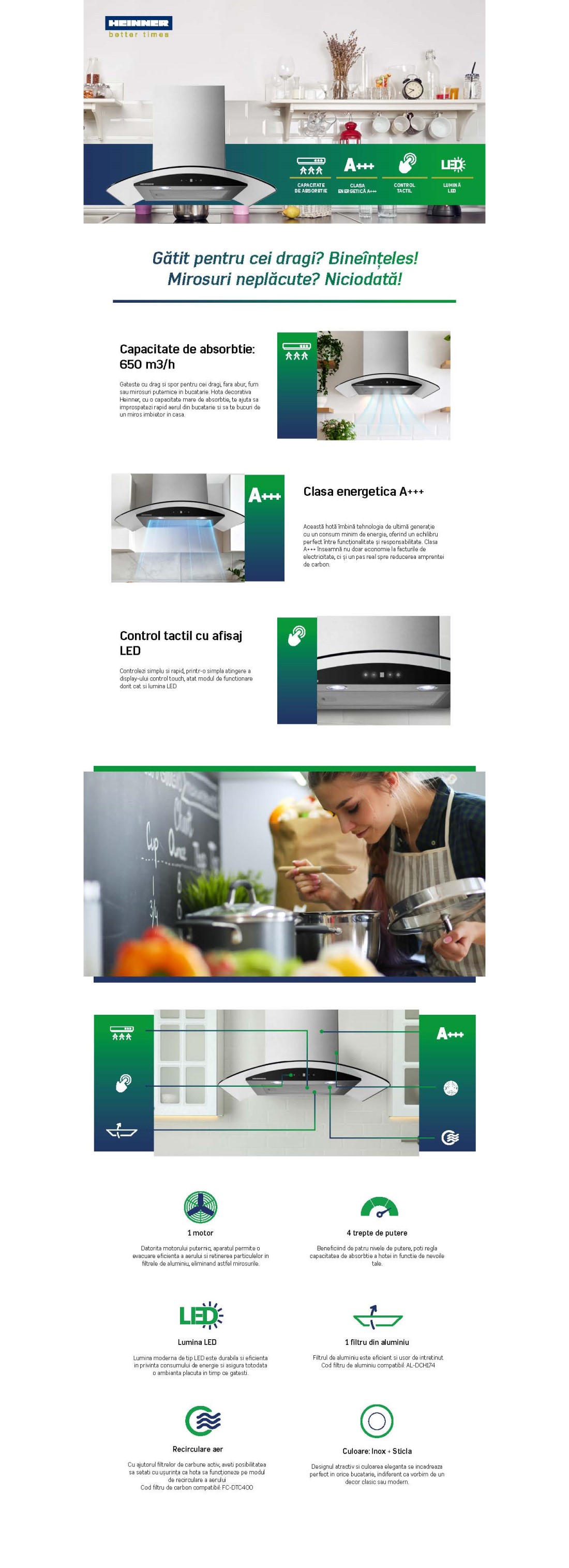 HOTA DECORATIVA HEINNER HDCH-MD650GIX, 60CM, DESIGN "T-SHAPE", PUTERE MAXIMA DE ABSORBTIE: 650 M3/H, A+++, 4 TREPTE DE VITEZA, MOTOR: 1 X 85W, LUMINA LED: 2 X 1.0W, 1 FILTRU ALUMINIU, CONTROL TOUCH, DIAMETRU TUB DE EVACUARE: 150 MM, DIMENSIUNI (LXAXI): 60X50X46 CM, CULOARE: INOX+STICLA