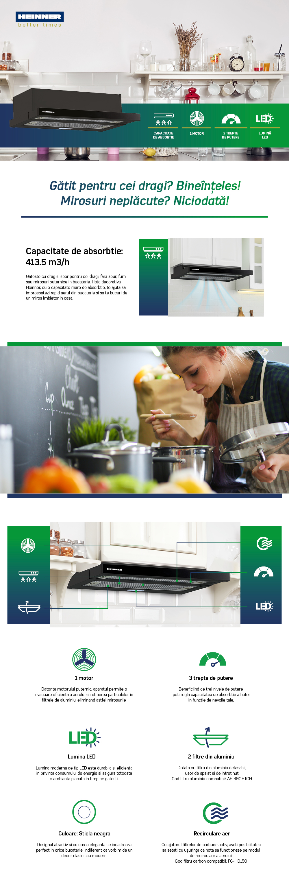 Hota telescopica Heinner HTCH-490GBK, 90cm, Putere maxima de absorbtie: 413.5 m3/h, 2 trepte de viteza, Motor: 1 x 105W, Lumina LED: 1 x 2W, 2 filtre aluminiu, Diametru tub de evacuare: 150 mm, Dimensiuni (LxAxI): 90x(28-45)x17.6 cm, Culoare: Negru+Sticla