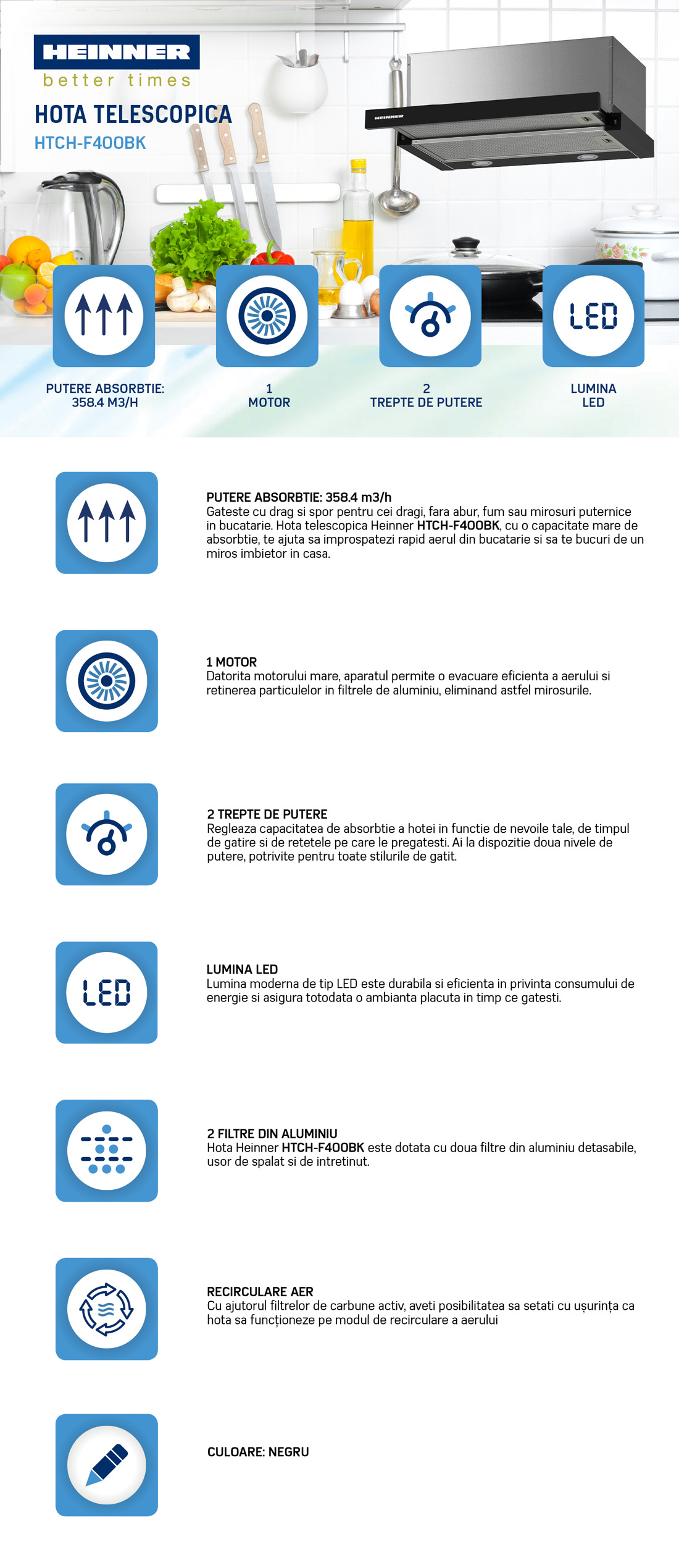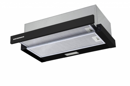 Hota telescopica Heinner HTCH-F400BK 60cm, Putere maxima de absorbtie: 358.4m3/h, 2 trepte de putere, Motor: 1 x 65W, Lumina LED: 1 x 2W, 2 filtre aluminiu, Diametru tub evacuare: 150 mm, Dimensiuni (LxAxI): 59.5x(30-46.3)x22.5 cm, Culoare: Negru