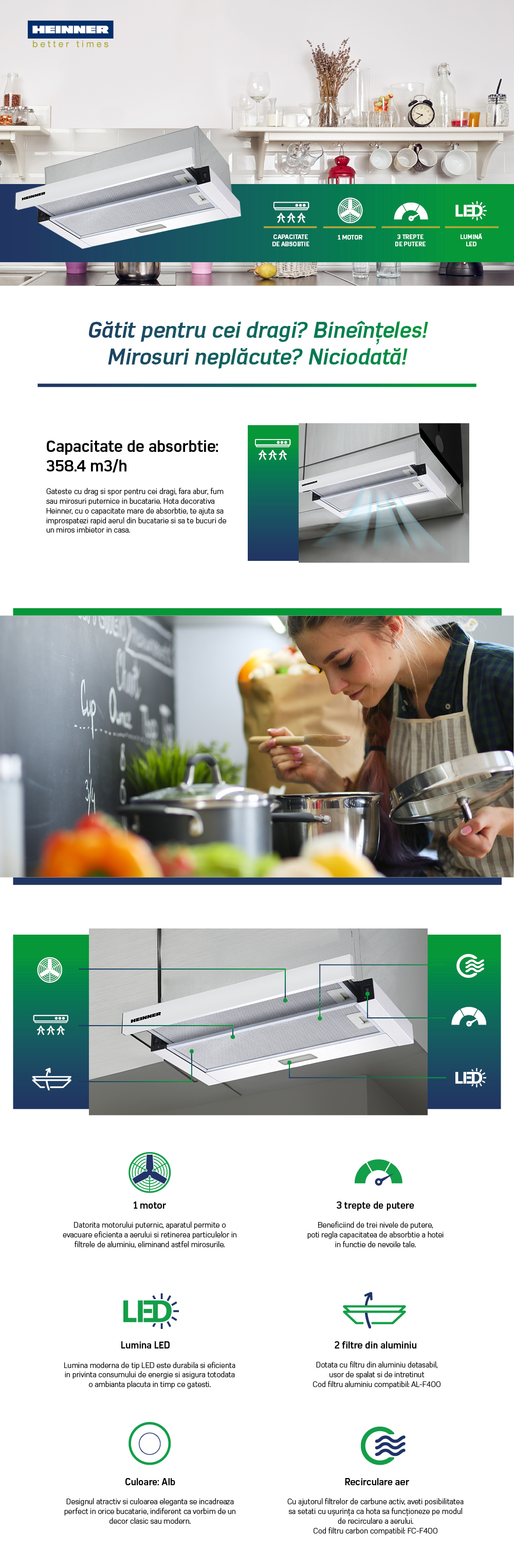 Hota telescopica Heinner HTCH-F400WH, 60cm, Putere maxima de absorbtie: 358.4m3/h, 2 trepte de putere, Motor: 1 x 65W, Lumina LED: 1 x 2W, 2 filtre aluminiu, Diametru tub evacuare: 150 mm, Dimensiuni (LxAxI): 59.5x(30-46.3)x22.5 cm, Culoare: Alb