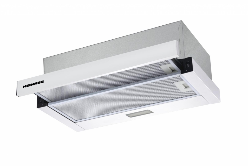 Hota telescopica Heinner HTCH-F400WH, 60cm, Putere maxima de absorbtie: 358.4m3/h, 2 trepte de putere, Motor: 1 x 65W, Lumina LED: 1 x 2W, 2 filtre aluminiu, Diametru tub evacuare: 150 mm, Dimensiuni (LxAxI): 59.5x(30-46.3)x22.5 cm, Culoare: Alb