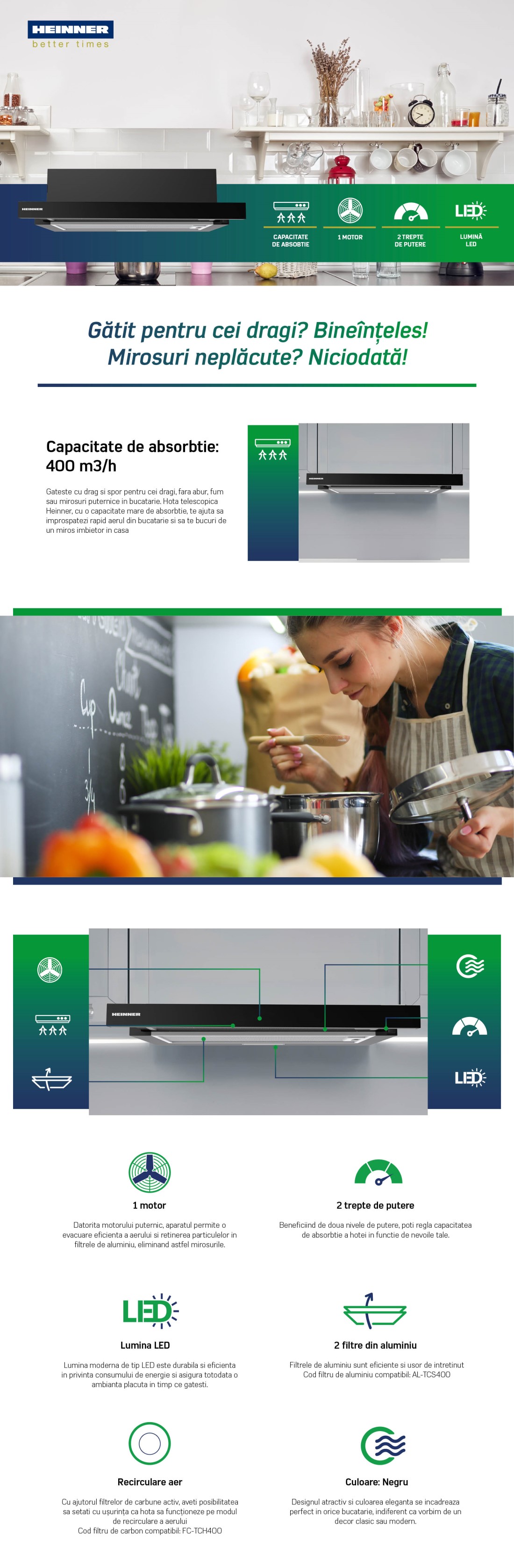 HOTA TELESCOPICA HEINNER HTCH-MD400GBK, 60CM, PUTERE MAXIMA DE ABSORBTIE: 400 M3/H, 2 TREPTE DE VITEZA, MOTOR: 1 X 45W, LUMINA LED: 1 X 1.5W, 2 FILTRE ALUMINIU, DIAMETRU TUB DE EVACUARE: 150 MM, DIMENSIUNI (LXAXI): 59.5X30.8X17.5 CM, CULOARE: NEGRU+STICLA