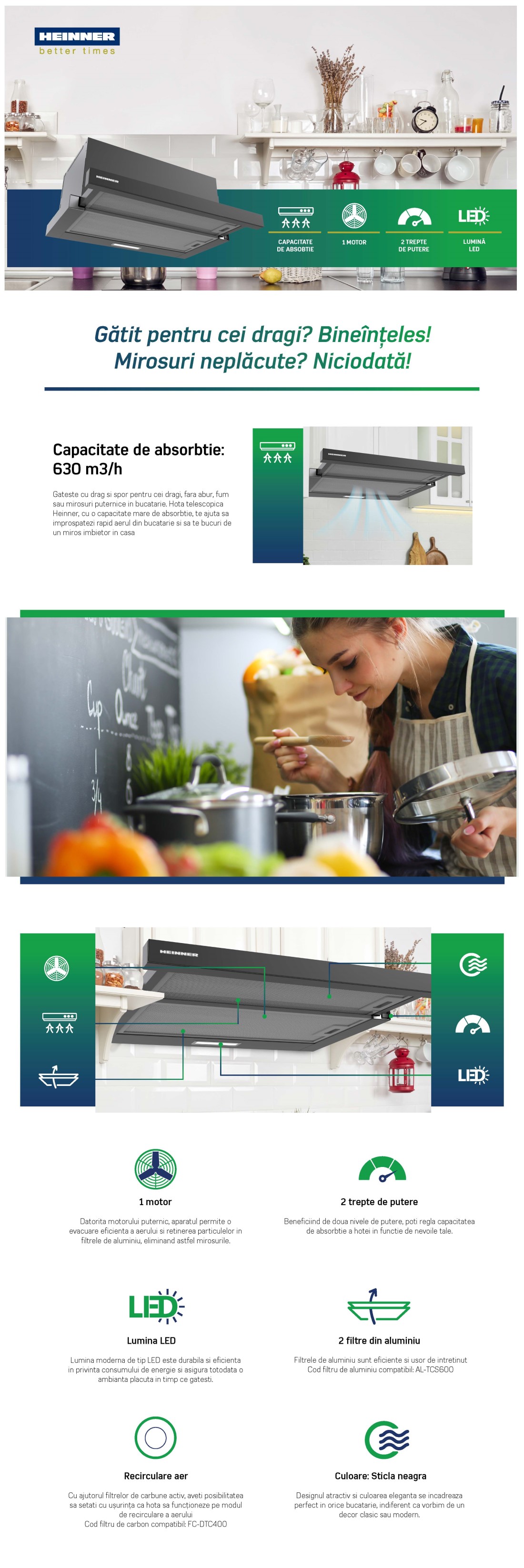 HOTA TELESCOPICA HEINNER HTCH-MD600GBK, 60CM, PUTERE MAXIMA DE ABSORBTIE: 630 M3/H, 2 TREPTE DE VITEZA, MOTOR: 1 X 215W, LUMINA LED: 1 X 1.5W, 2 FILTRE ALUMINIU, DIAMETRU TUB DE EVACUARE: 150 MM, DIMENSIUNI (LXAXI): 59.5X30.8X25.5 CM, CULOARE: NEGRU+STICLA