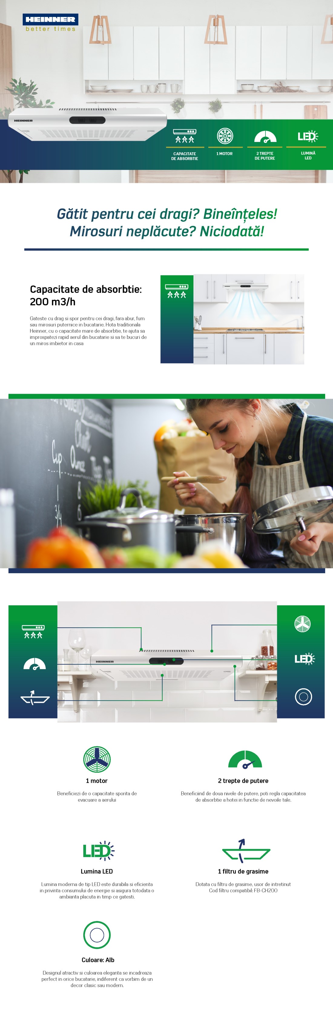 HOTA TRADITIONALA HEINNER CH-MD200WH, 60CM, PUTERE MAXIMA DE ABSORBTIE: 200 M3/H, 2 TREPTE DE VITEZA, MOTOR: 1 X 38W, LUMINA LED: 1 X 1.5W, 1 FILTRU GRASIME, BUTOANE TIP “PUSH”, DIAMETRU TUB DE EVACUARE: 120 MM, DIMENSIUNI (LXAXI): 60X48X10.5 CM, CULOARE: ALB