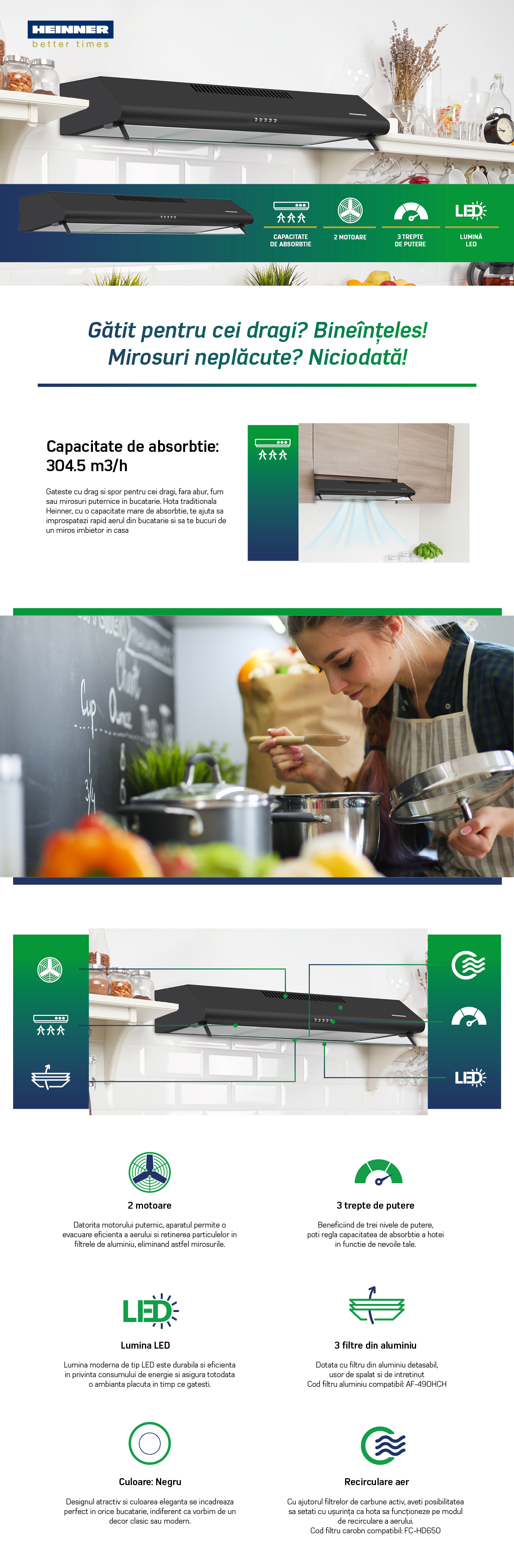 Hota traditionala Heinner HCH-490-BK, 90cm, Putere maxima de absorbtie: 304.5 m3/h, 3 trepte de viteza, Motor: 2 x 60W, Lumina LED: 2 x 2W, 3 filtre aluminiu, Panou sticla frontal, Butoane tip “push”, Diametru tub de evacuare: 120 mm, Dimensiuni (LxAxI): 90x50x15 cm, Culoare: Negru