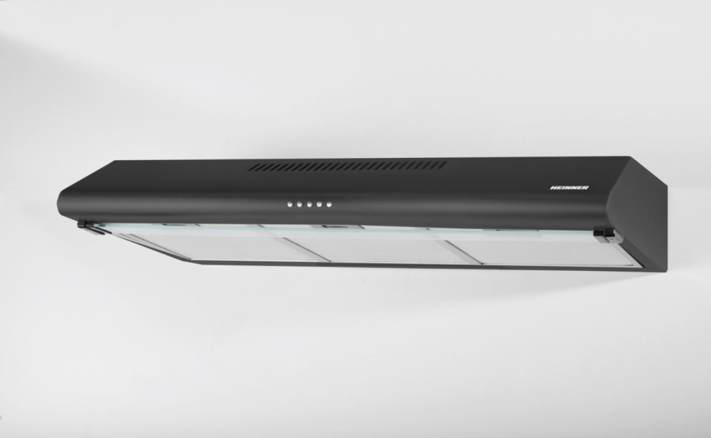 Hota traditionala Heinner HCH-490-BK, 90cm, Putere maxima de absorbtie: 304.5 m3/h, 3 trepte de viteza, Motor: 2 x 60W, Lumina LED: 2 x 2W, 3 filtre aluminiu, Panou sticla frontal, Butoane tip “push”, Diametru tub de evacuare: 120 mm, Dimensiuni (LxAxI): 90x50x15 cm, Culoare: Negru