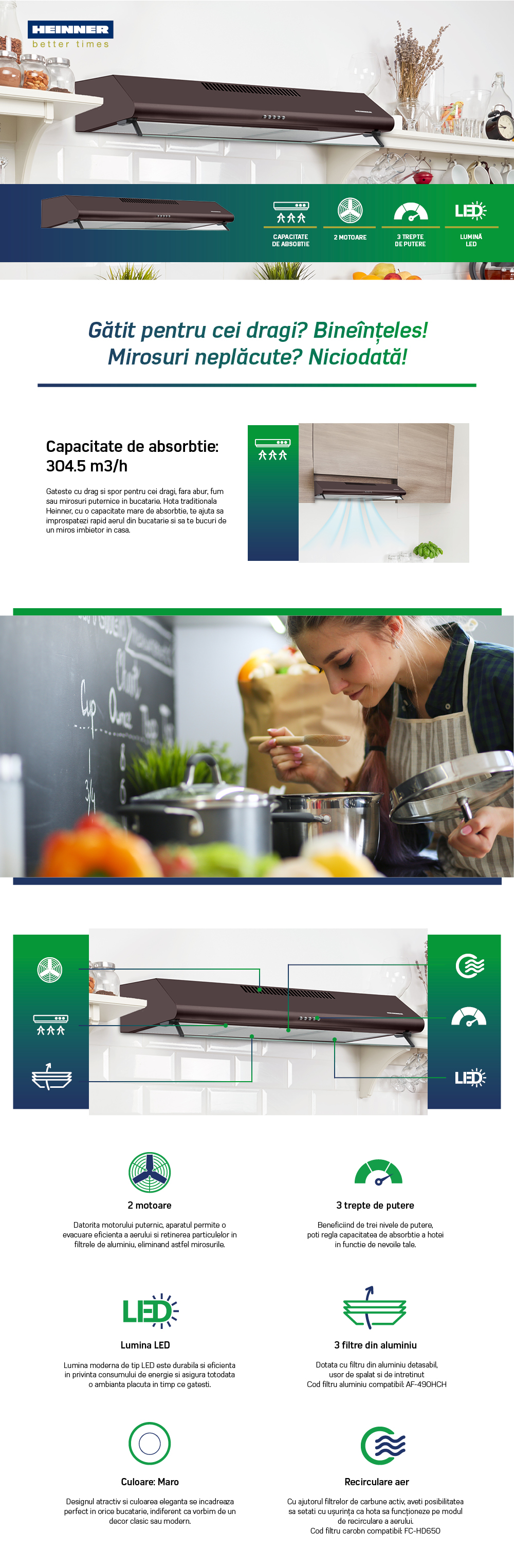 Hota traditionala Heinner HCH-490-BRW, 90cm, Putere maxima de absorbtie: 304.5 m3/h, 3 trepte de viteza, Motor: 2 x 60W, Lumina LED: 2 x 2W, 3 filtre aluminiu, Panou sticla frontal, Butoane tip “push”, Diametru tub de evacuare: 120 mm, Dimensiuni (LxAxI): 90x50x15 cm, Culoare: Maro