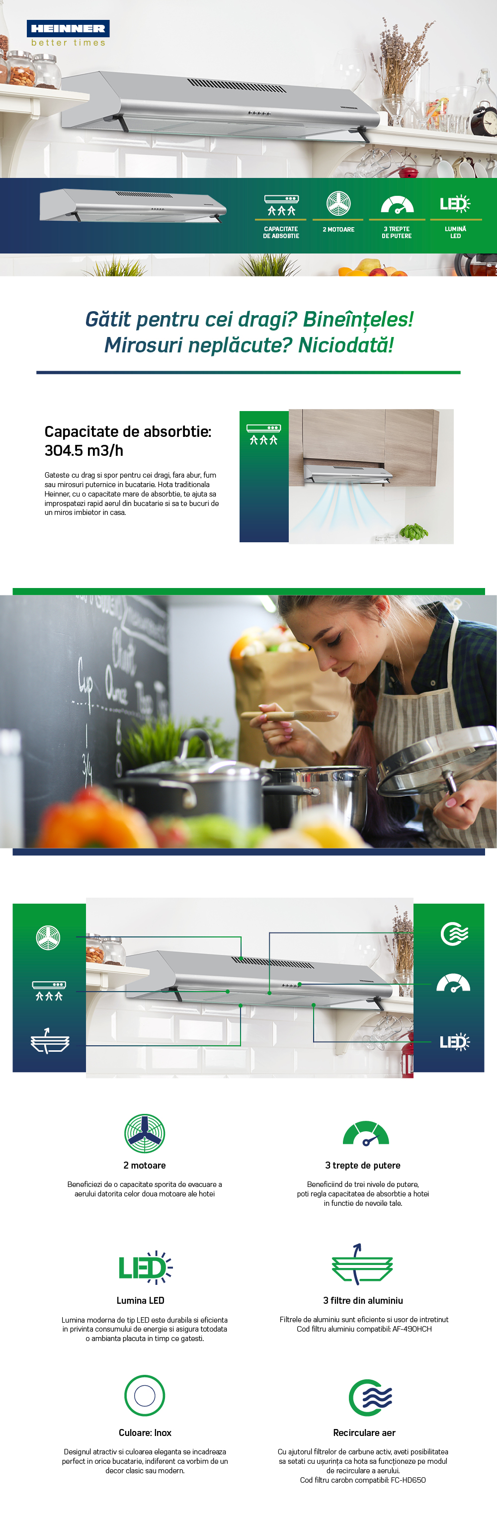 Hota traditionala Heinner HCH-490-SS, 90cm, Putere maxima de absorbtie: 304.5 m3/h, 3 trepte de viteza, Motor: 2 x 60W, Lumina LED: 2 x 2W, 3 filtre aluminiu, Panou sticla frontal, Butoane tip “push”, Diametru tub de evacuare: 120 mm, Dimensiuni (LxAxI): 90x50x15 cm, Culoare: Inox
