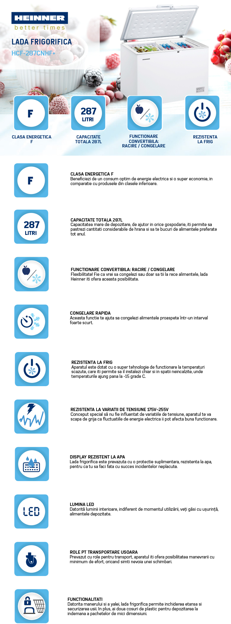 Lada frigorifica Heinner HCF-287CNHF+, convertibila, clasa energetica: F, capacitate totala: 287L, control electronic, rezistenta la frig (opereaza la temperaturi scazute: -15°C), rezistenta la variatii de tensiune 175~255V, display rezistent la apa, lumi