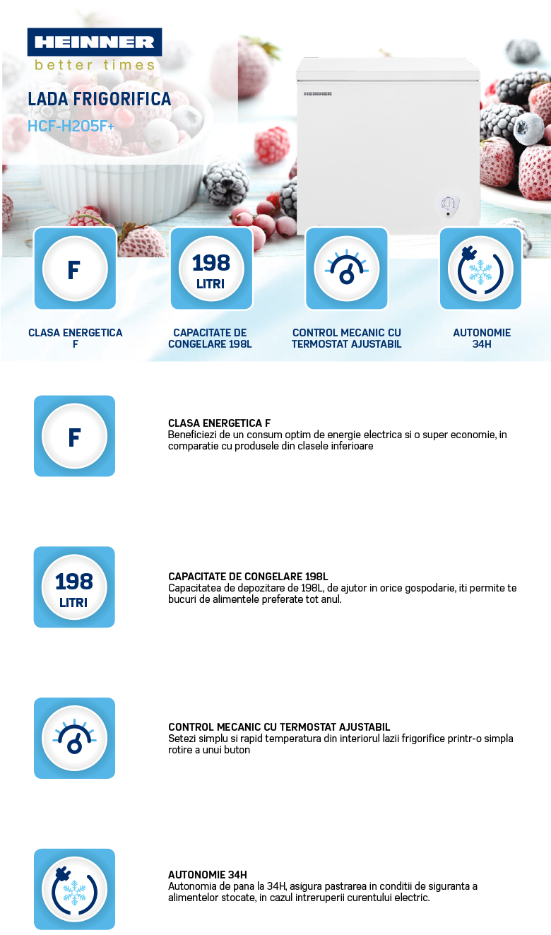 Lada frigorifica Heinner HCF-H205F+, clasa energetica: F, capacitate totala: 198L, control mecanic cu termostat ajustabil, cos din sarma, maner integrat, decongelare manuala, capacitate de congelare: 9kg/24h, dimensiuni (WxDxH): 80.2 × 55.9 × 85.4 cm, culoare: alb.