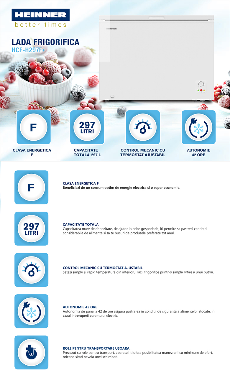 Lada frigorifica Heinner HCF-H297F+, capacitate: 297 L, clasa energetica: F, control mecanic, 2 cosuri, maner integrat, culoare: alb