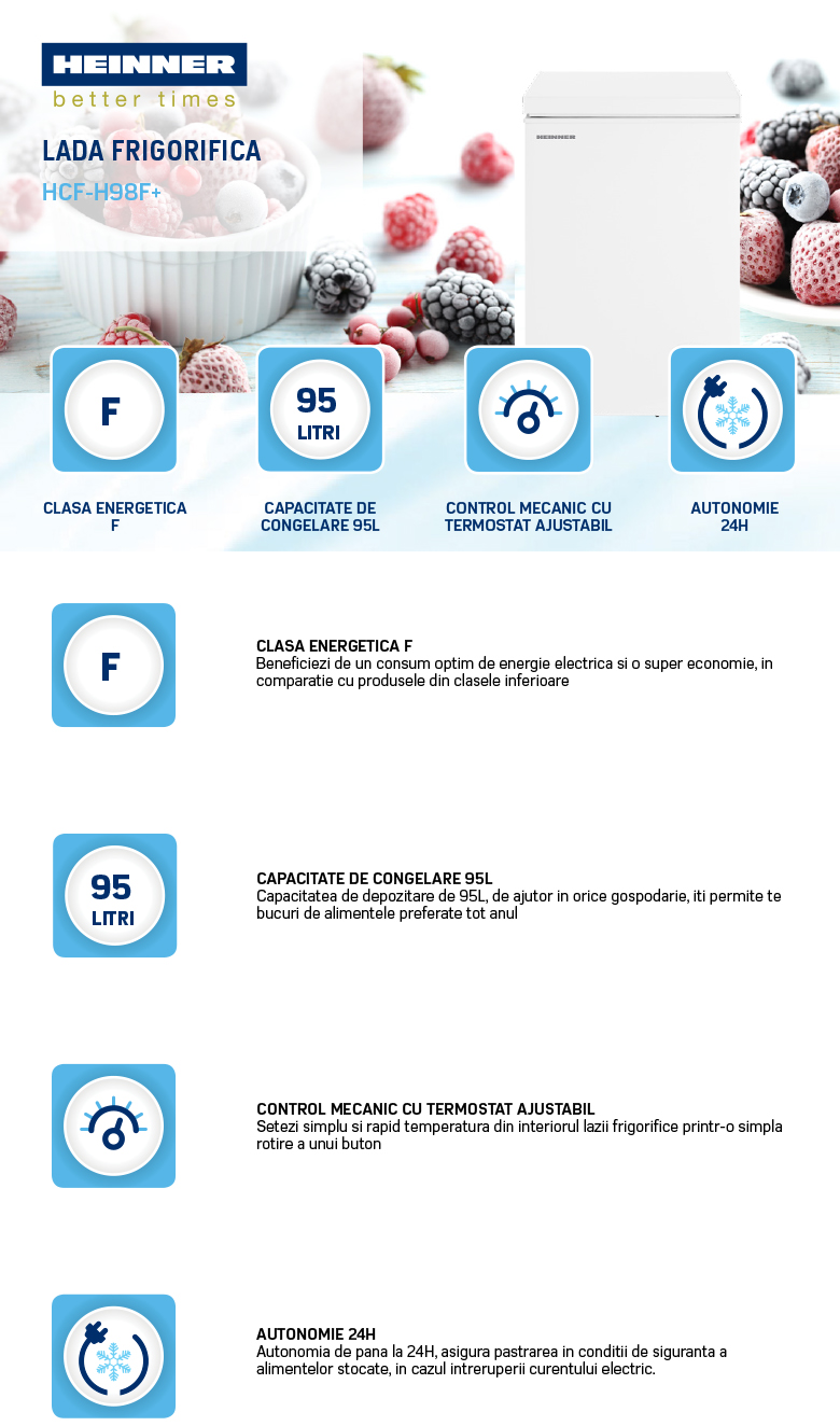 Lada frigorifica Heinner HCF-H98F+, clasa energetica: F, capacitate totala: 95L, control mecanic cu termostat ajustabil, cos din sarma, maner integrat, decongelare manuala, capacitate de congelare: 4.8kg/24h, dimensiuni (WxDxH): 54.6 × 47.9 × 85.4 cm, culoare: alb.