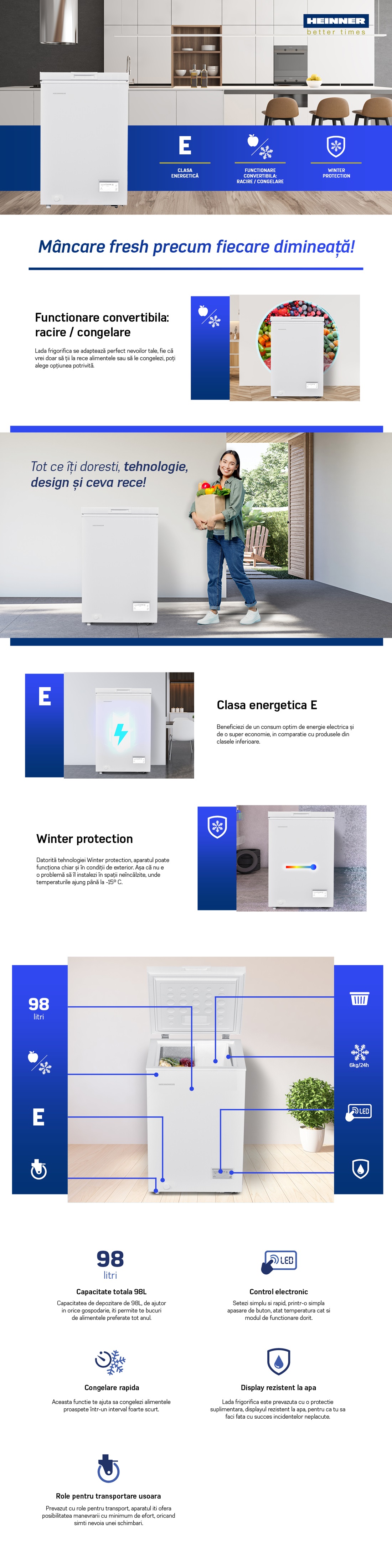 Lada frigorifica Heinner HCF-HM100CE++, clasa energetica: E, functionare convertibila (Frigider/Congelator), capacitate totala: 98L, control electronic, rezistenta la frig (opereaza la temperaturi scazute: pana la -15°C), display rezistent la apa, functie congelare rapida, cos din plastic, maner integrat, decongelare manuala, capacitate de congelare: 6 kg/24h, dimensiuni (WxDxH): 54.5 × 54.5 × 84.5 cm, culoare: Alb