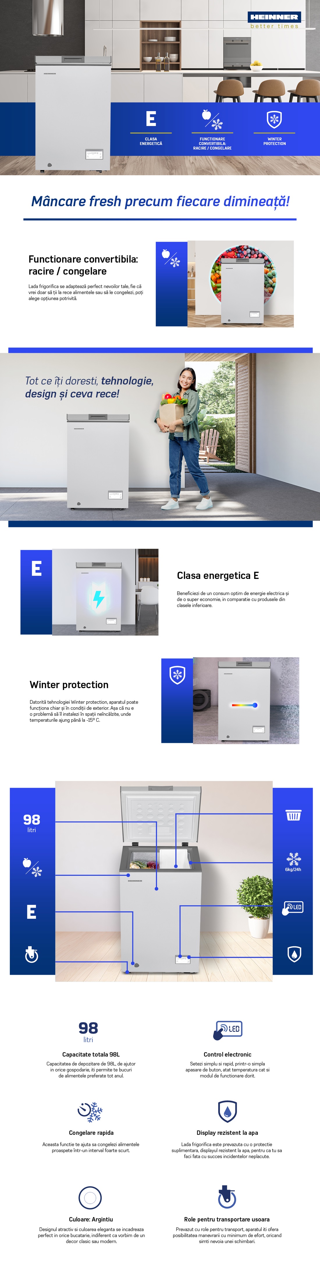 Lada frigorifica Heinner HCF-HM100CSE++, clasa energetica: E, functionare convertibila (Frigider/Congelator), capacitate totala: 98L, control electronic, rezistenta la frig (opereaza la temperaturi scazute: pana la -15°C), display rezistent la apa, functie congelare rapida, cos din plastic, maner integrat, decongelare manuala, capacitate de congelare: 6 kg/24h, dimensiuni (WxDxH): 54.5 × 54.5 × 84.5 cm, culoare: Argintiu