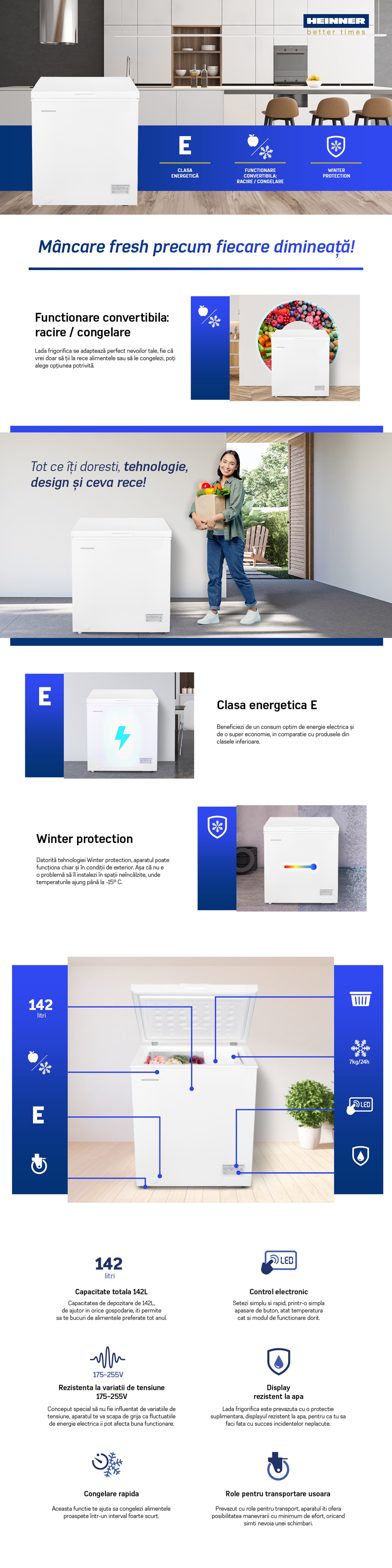 Lada frigorifica Heinner HCF-HM145CE++, convertibila frigider/congelator, clasa energetica: E, capacitate totala: 142L, control electronic, rezistenta la frig (opereaza la temperaturi scazute: -15°C), rezistenta la variatii de tensiune 175~255V, display rezistent la apa, functie congelare rapida, 1 cos, decongelare manuala, capacitate de congelare: 7kg/24h, dimensiuni (WxDxH): 70.5 × 54.5 × 84.5 cm, culoare: alb