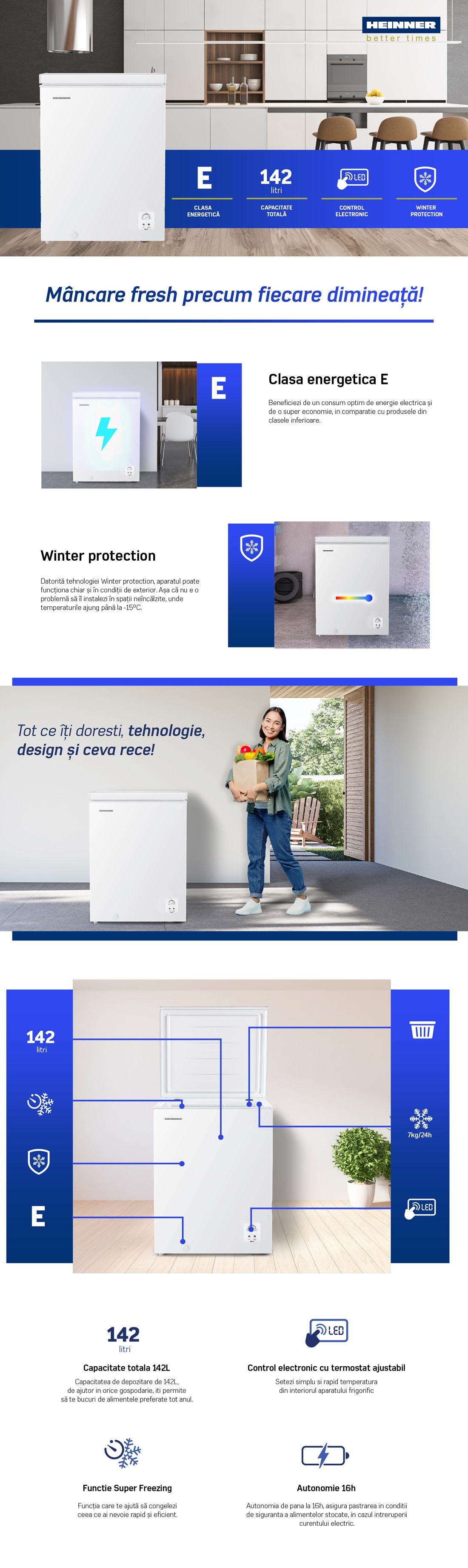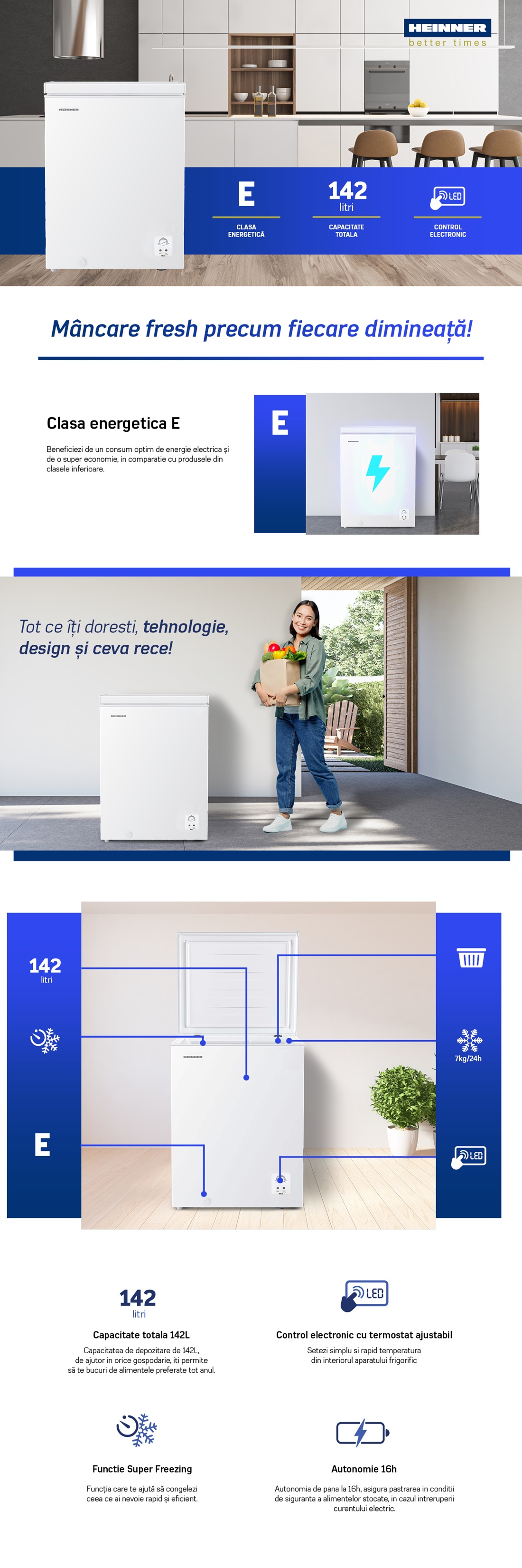 Lada frigorifica Heinner HCF-HS142E++, capacitate totala: 142L, clasa energetica: E, control electronic cu termostat ajustabil, functie Super congelare, cos din sarma, maner integrat, decongelare manuala, capacitate de congelare: 7kg/24h, dimensiuni (WxDxH): 62.5 × 55.9 × 85.4 cm, culoare: Alb