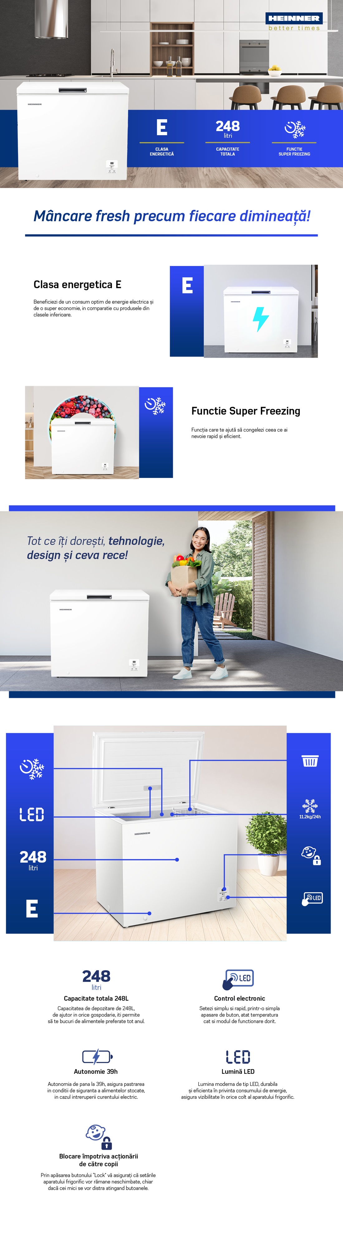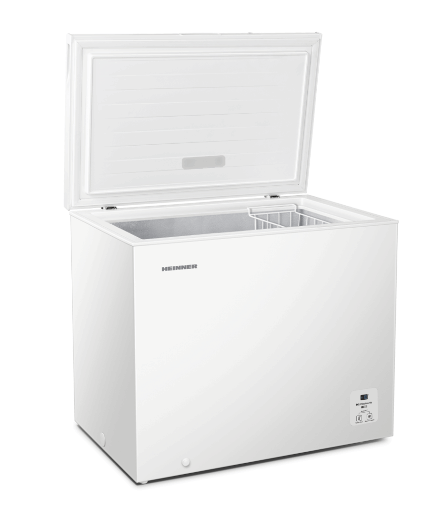 Lada frigorifica Heinner HCF-HS248EE++, capacitate totala: 248L, clasa energetica: E, control electronic, display LED, functie Super congelare, lumina LED, cos din sarma, maner integrat, blocare acces copii, decongelare manuala, capacitate de congelare: 11.2kg/24h, dimensiuni (WxDxH): 96.3 x 63 x 84.7 cm, culoare: Alb