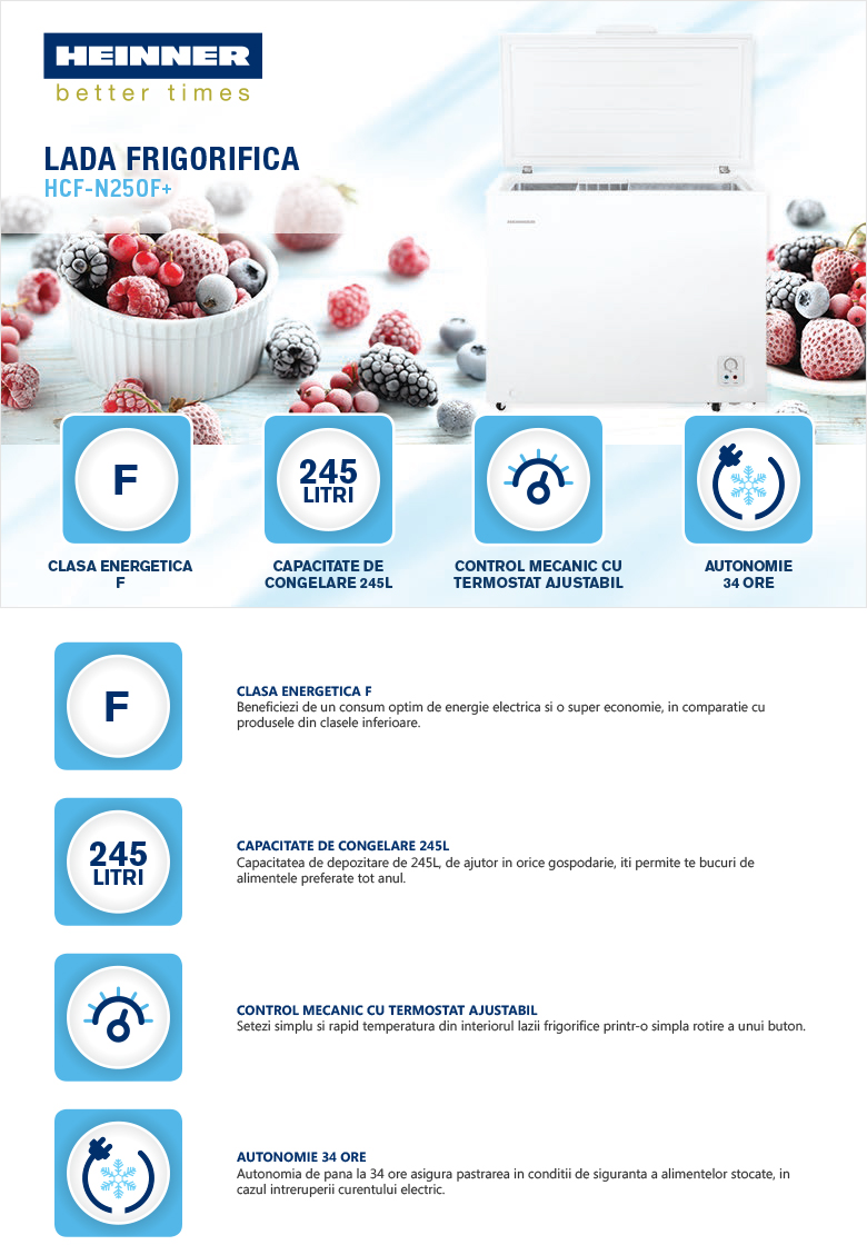 Lada frigorifica Heinner HCF-N250F+, clasa energetica: F, capacitate totala: 245L, control mecanic cu termostat ajustabil, cos din sarma, maner exterior, decongelare manuala, role pentru transportare usoara, capacitate de congelare: 12kg/24h, dimensiuni (WxDxH): 100.2 x 59.7 x 84.2 cm, culoare: alb