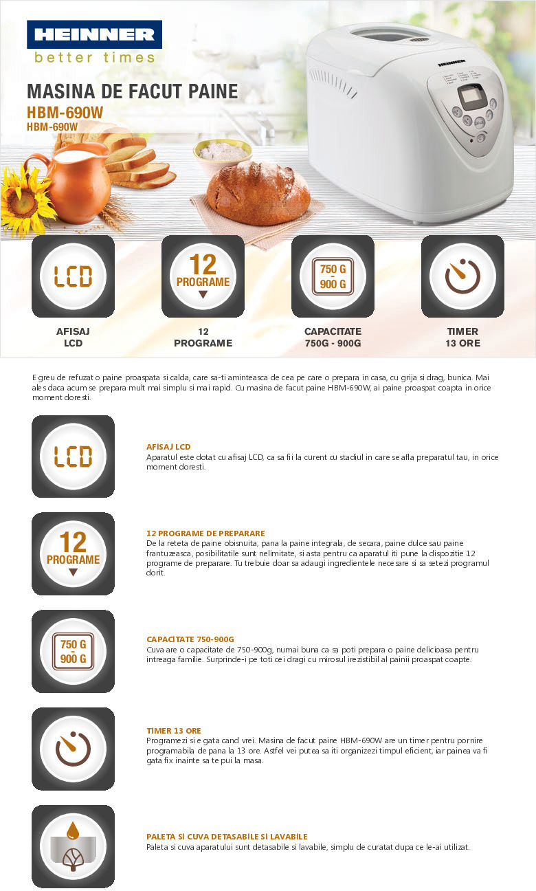 Masina de facut paine Heinner HBM-690W, putere: 600 W, capacitate: 750- 900 g, 12 programe, functie mentinere cald: 60 minute, 3 nivele de rumenire: deschis, mediu, inchis, timer: maxim 13 ore, paleta si cuva anti-adezive detasabile, pahar si lingurita pentru masurare, picioruse anti-alunecare, culoare: alb